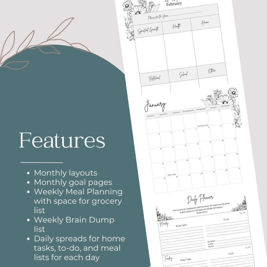 This planner is designed to help women in all phases of life manage their homes and time well. This version comes in a downloadable PDF file that you can print at your local printer or in the comfort of your own home.